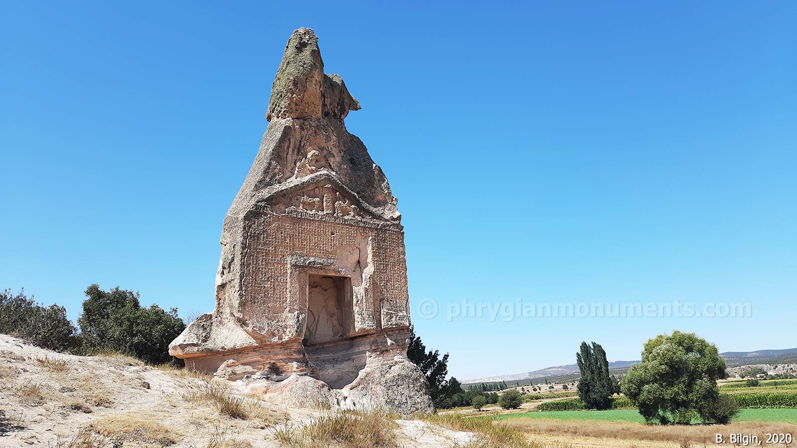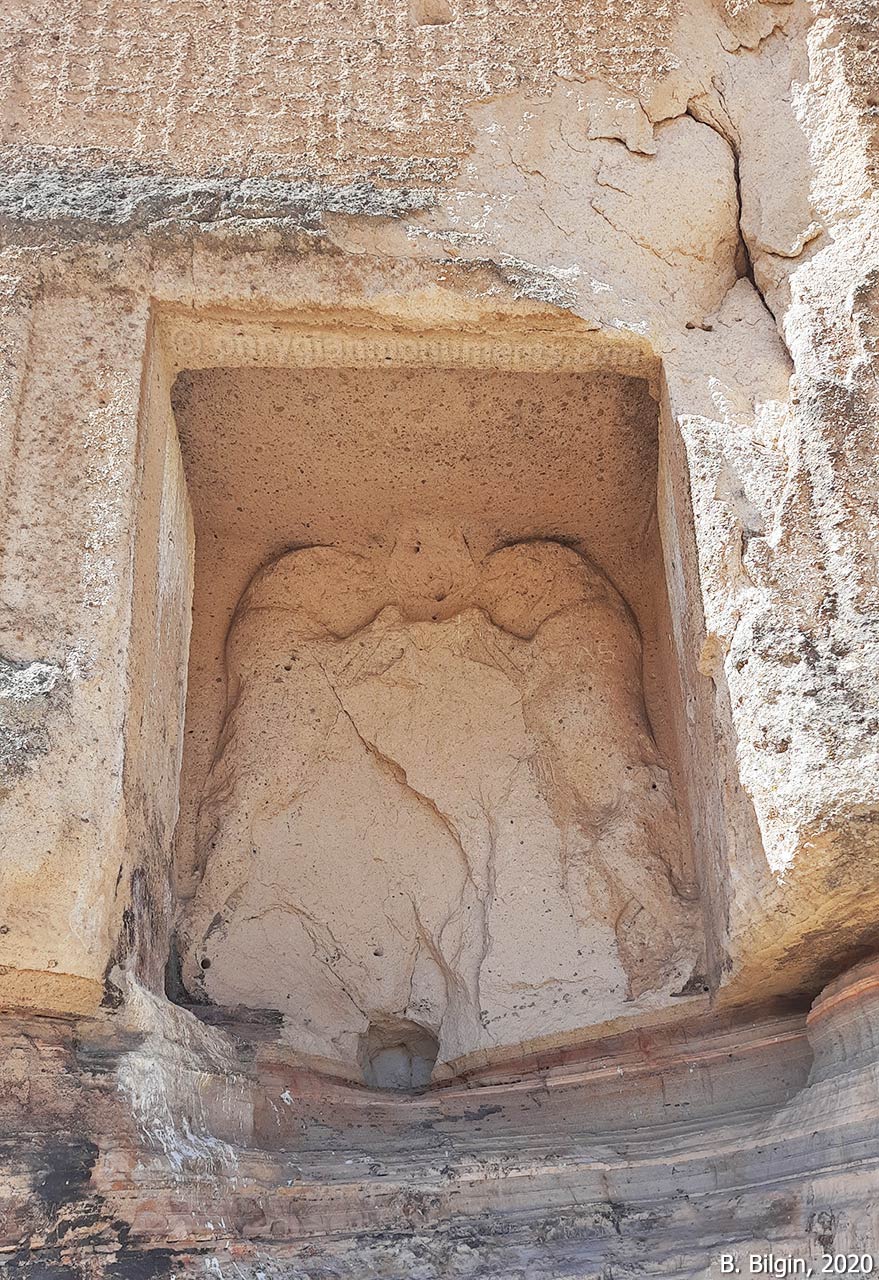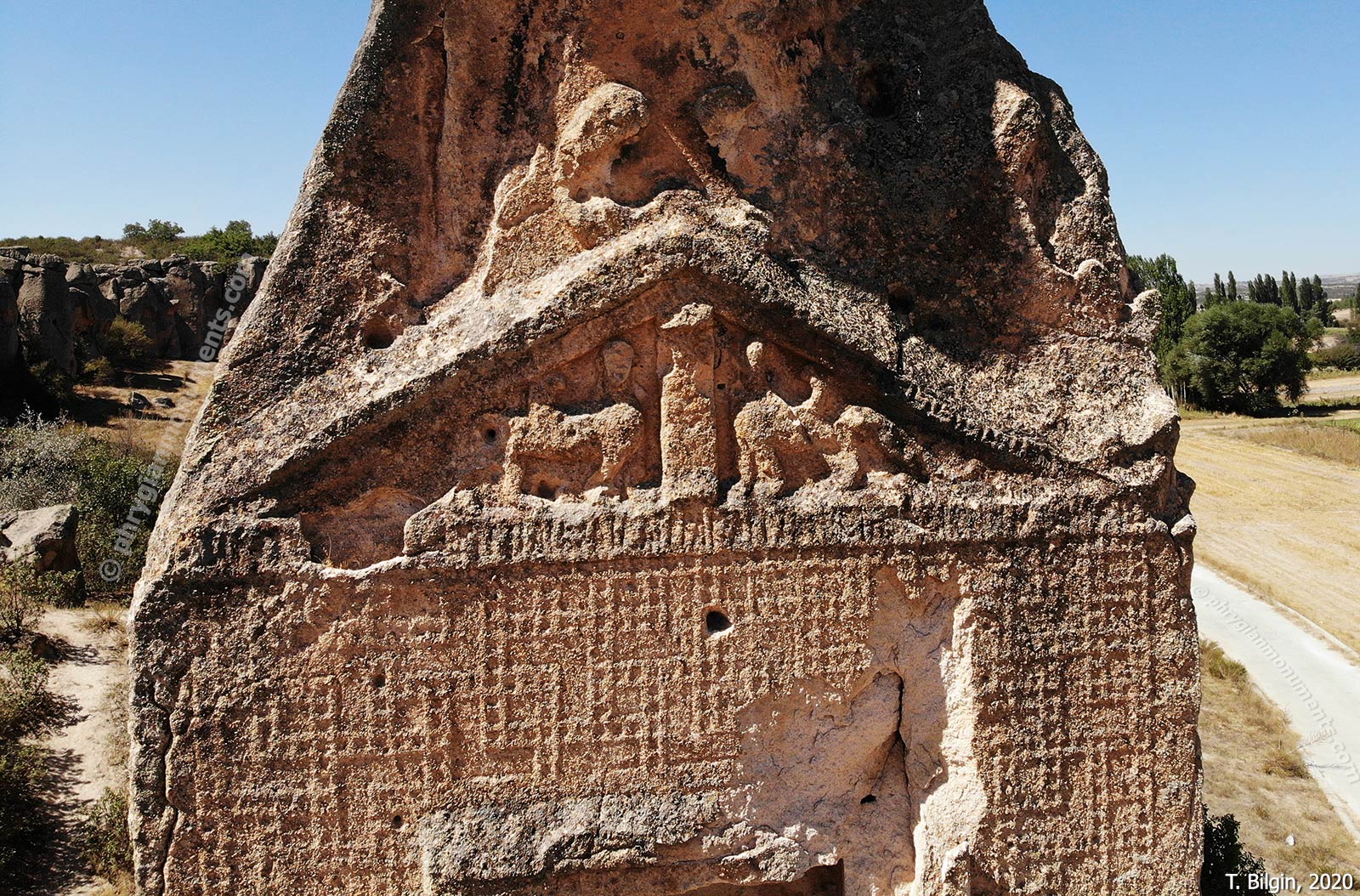 Two winged sphinxes are depicted symmetrically on both sides of the central pillar on the roof. There is an Old Phrygian inscription (W‑03) on the main beam. Due to weathering, the inscription is hardly readable. The main façade under the roof is decorated with geometric patterns. Inside the niche on the left and right walls, there are the reliefs of two doors that give the appearance of two open door wings. The door shafts and the bolt on the right wing indicate that they were modeled like wooden doors. The high relief sculpture in the middle of the niche is most probably a mother goddess Matar depiction. There are lion reliefs on both sides of the mother goddess.