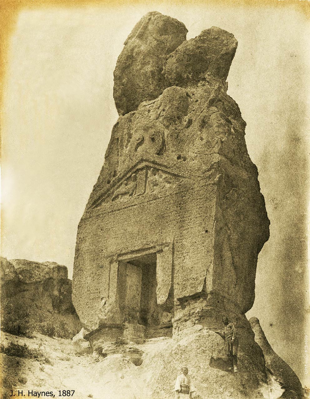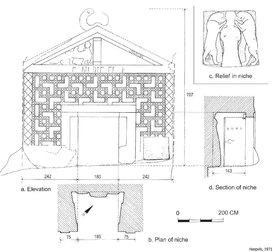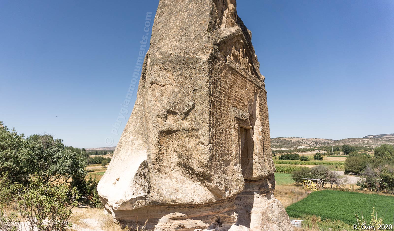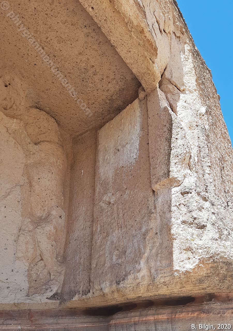 Two winged sphinxes are depicted symmetrically on both sides of the central pillar on the roof. There is an Old Phrygian inscription (W‑03) on the main beam. Due to weathering, the inscription is hardly readable. The main façade under the roof is decorated with geometric patterns. Inside the niche on the left and right walls, there are the reliefs of two doors that give the appearance of two open door wings. The door shafts and the bolt on the right wing indicate that they were modeled like wooden doors. The high relief sculpture in the middle of the niche is most probably a mother goddess Matar depiction. There are lion reliefs on both sides of the mother goddess.